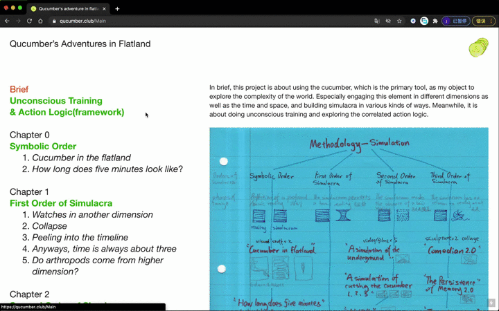 It is about using the cucumber, doing unconscious training and exploring the correlated action logic, as well as looking for my methodology of creation, combining the framework of “Orders of Simulacra” by Jean Baudrillard, and designing a website as my outcome to organize the whole process.